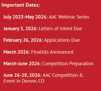 Important dates to remember: Optional letters of intent are due January 5, 2026, with final applications due February 26, 2026. Twenty finalists will be announced in the spring and invited to participate in the second stage of the competition, held June 26–28, 2026, in Denver, CO. There, communities will present their efforts to a jury of experts for a chance to earn the title of All-America City! Don’t miss this opportunity to showcase your community on a national stage!